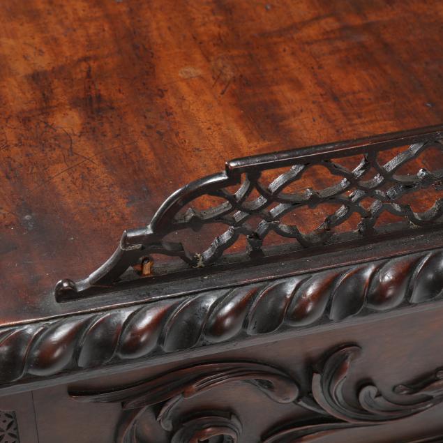 Late 19th century, deal secondary, rectangular single board top with good figuring and gadrooned edge, applied fretwork backsplash with ormolu mounts and central carved floral urn, upper long drawer over smaller drawers all with divided interiors, the lower right with a removable divided dovetailed tray, all drawer fronts with applied carved foliate and scroll work, the stiles with diapered panel over bellflowers, the case sides with repeating applied carved scrollwork and diapered / scaled stiles, bold straight tapered legs with relief carved bellflowers, carved returns, spade feet with incised carving, plain finished back.