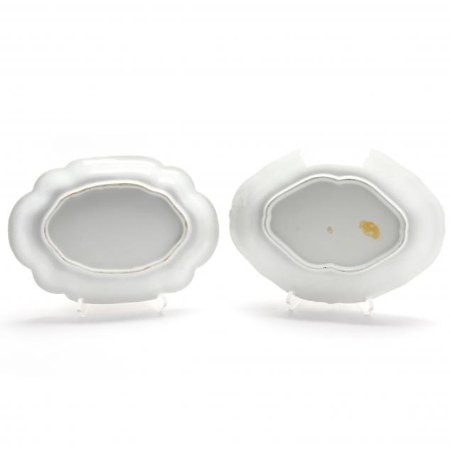 England, first quarter 19th century, (4) oval in form, one with a Derby mark, others unmarked (2 with staple repairs); a square plate marked Chamberlain's Worcester (11/2 x 8 1/4 in.); (2) round small plates unmarked; and (3) Derby