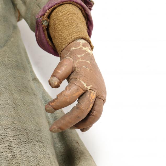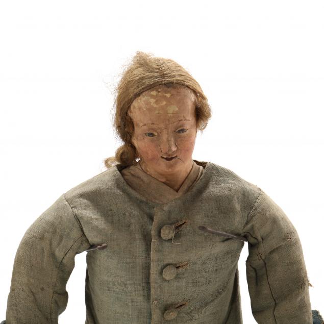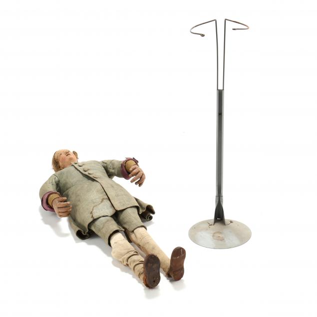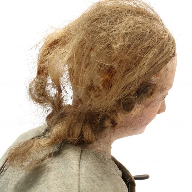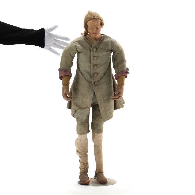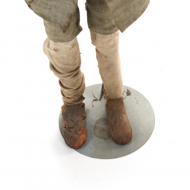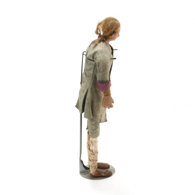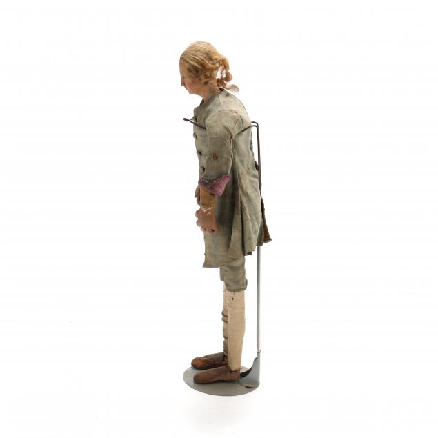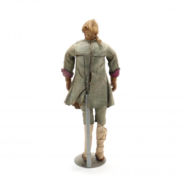Early 19th century, wood armature with carved polychrome face, natural hair, custom tailored textile garments and stuffed appendages, the pants verso stitched with dual-sided card stamped "S /19," mounted atop a later custom metal stand.