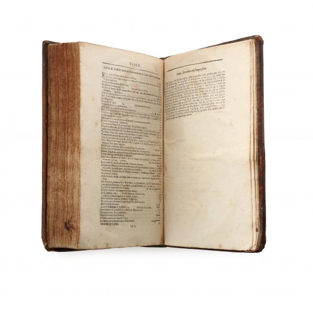 Some scuffing and wear to boards, (3) corners heavily rubbed, joints and spine with creases, light wear at head of spine with tiny loss at tail; small stain at fore-edge; free endpapers with wormholes, staining, and manuscript, one endpaper removed; title page with stamp of Congregation of Notre-Dame De Verdun; pages with toning and foxing, both occasionally heavy; occasional light grime or small stain, loss, or tear; some damp staining at margins with heavier damp staining at final gatherings, (2) leaves with larger margin tear, 2K1 trimmed at lower and outer margin not impacting text, 3D1 with small sticker at inner margin. A rare first edition, especially with portrait frontispiece; found mostly in institutions, extremely scarce at market.