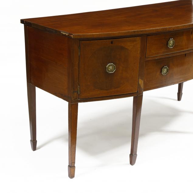 Circa 1800, mahogany veneer, oak and pine secondary, top with light wood line inlay to edge, two central drawers flanked by two hinged cabinet doors, all with line and panel inlays, raised on square tapered legs with line inlay and spade feet.