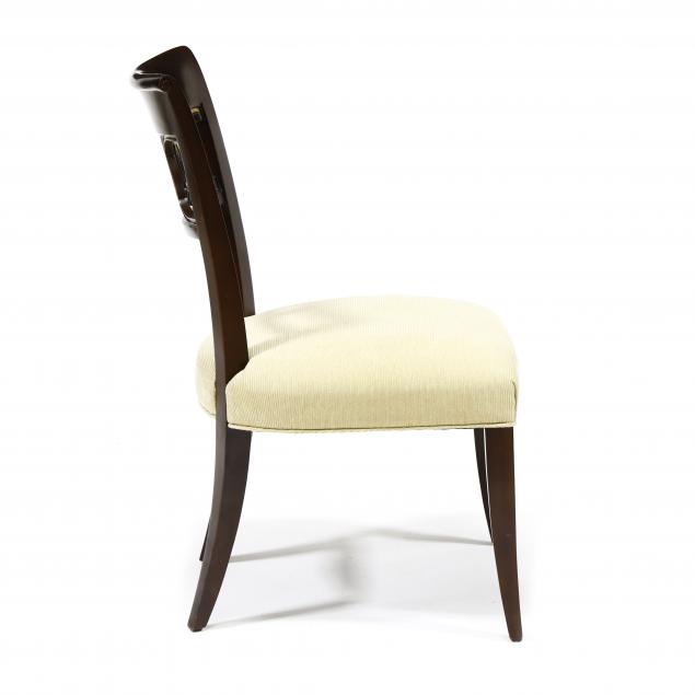 Designed by Thomas Pheasant, mahogany, including two arm chairs and eight side chairs, with curved pierced and gilt panel backs, over upholstered seats on saber legs, labeled.