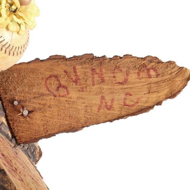 Created of sawn and natural wood formations with baseball and plastic flower eyes, signed on one ear interior "Bynum NC"and on the other ear interior "Clyde Jones 1997".