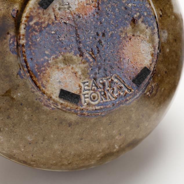 Foot fired: a large charger salt glaze and alkaline, the center decorated with glaze and raised white slip stylized forms (16 1/2 in.) signature not found, a lidded jar, alkaline glazed, decorated in shite slip (6 1/4 in.) stamped "East Fork", and a bud vase (7 in.) impressed glyph to the underside.