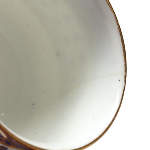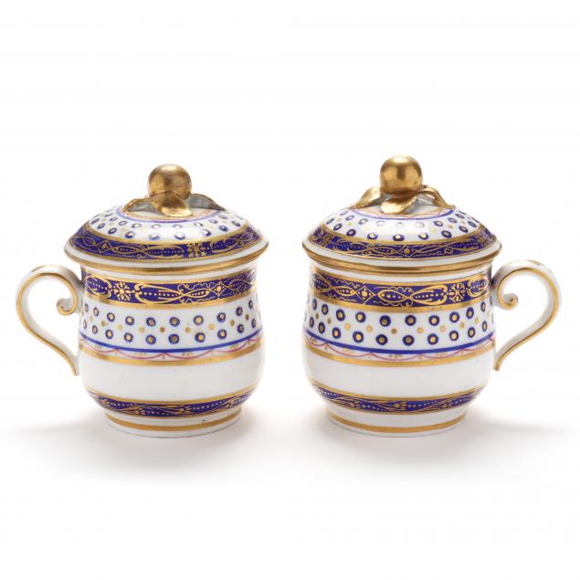 Circa 1795, painted with borders of blue and gold above and below gilt 'dot' decoration, the finial is shaped as a peach with leaves, the scrolled handle picked out with a gilt design, the undersides marked with interlaced monogram in blue. With hardwood stands.