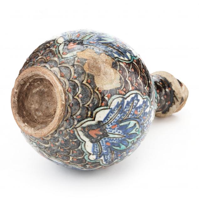 Includes a molded vessel, 19th century or earlier, likely Turkish from the Kutahya province, featuring vignettes of blue foliate decoration against a scalloped black ground; a large Persian vase and bottle, Iran, Qajar Dynasty (1779-1924), the vase with foliate and bird motifs, and the bottle with alternating concave vignettes of foliate motifs.