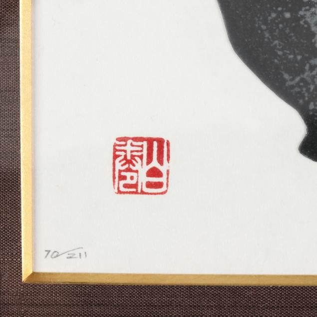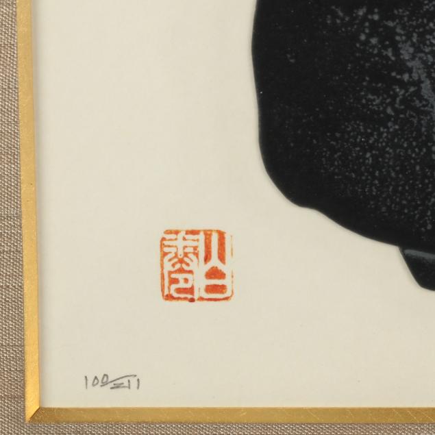 Each an intaglio woodblock print in colors, dates ranging from 1953-1968, signed and numbered out of 211 to lower margin, stamped with a seal, matted, and framed under glass.