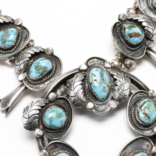 The silver bead necklace with the central naja set with cabochon turquoise and with feather motifs, necklace completed with twelve blossoms set with cabochon turquoise with repeating feather motif and with drops.