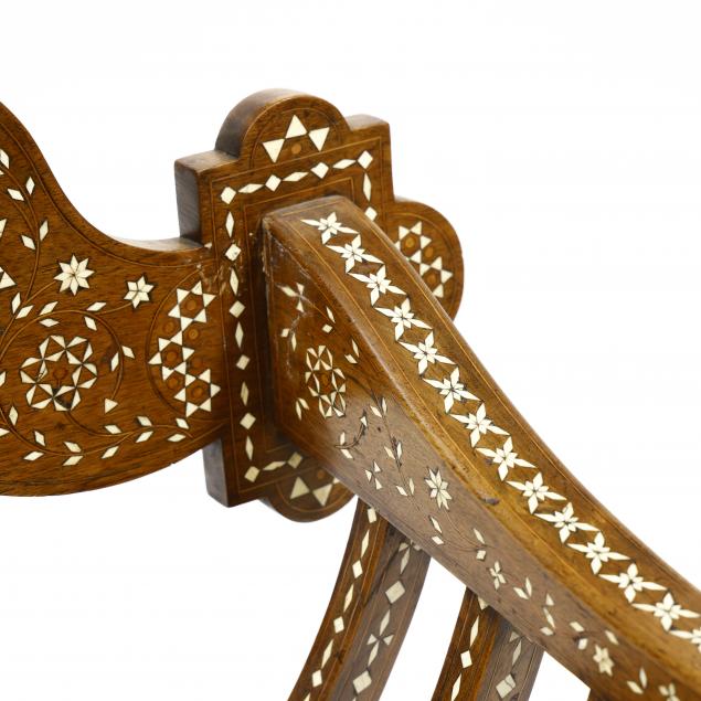 19th century, bone, ivory, ebony and metal inlays, shaped and relief carved crest with central inlaid plaque of a well dressed figure, shaped arms, interlocking shaped stiles and fitted plank seat, stylized shoe feet, all with geometric and line inlays.