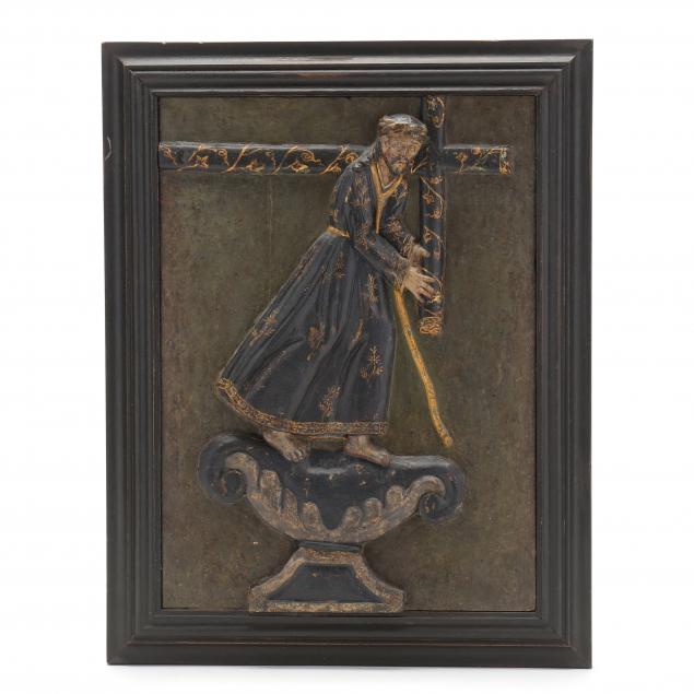 19th century, relief carved wood with polychrome and gilt, depicting Christ bearing the cross, wearing gilt and ebonized robe with conforming decoration to cross, and standing on a scrolled foliate plinth, hinged within a molded frame, with open cabinet interior, bracketed for wall display.