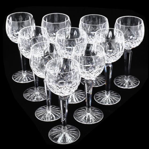 Ireland, late 20th century, including (6) champagne coupes (4 1/8 in.); (4) brandy snifters (5.25 in.); (10) wine hocks (7.5 in.); (7) water glasses (5 1/8 in.); (6) dessert wines (5.25 in.); (7) red wines (6.5 in.); and (2) white wines (6 in.), signed.