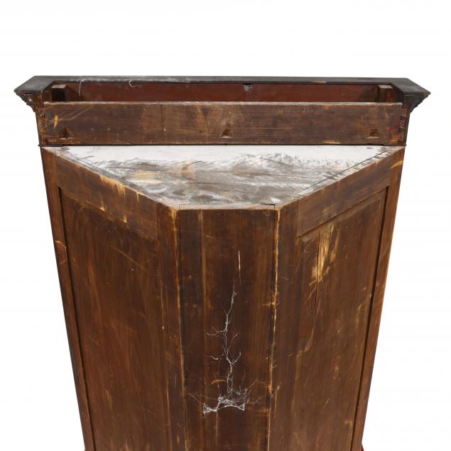 Restoration including later rear leg; back boards rebuilt with wire head nails; cabinet doors restructured with plugs; some shrinkage cracks to the doors.