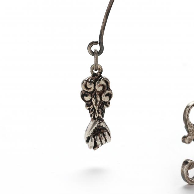 A two-part kinetic form, the dancing figure marked .833, both ends of the balancing wire is a "figa" or Brazilian good luck charm, the coin a 2000 Réis dated 1924, total silver content unknown.