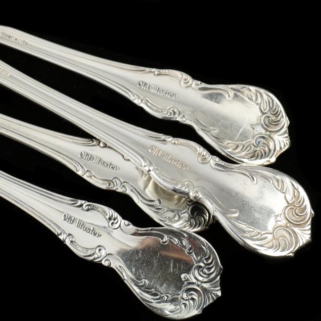 (63) pieces to include: (12) dinner knives (8 3/4 in.); (12) forks (7 1/8 in.); (12) salad forks (6 1/4 in.); (14) teaspoons (5 7/8 in.); (5) oval bowl soup spoons; (2) tablespoons; (2) flat handle butter spreaders; a sugar spoon; a gravy ladle; a master butter spreader; and a pie or cake server (10 1/4 in.), approximately half of the set with monograms.