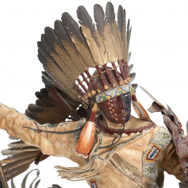 "American Horses" depicts the 19th century Oglala Sioux Chief astride an appaloosa. The warshirt and headdress are traditional in style. The banner of eagle feathers represents the warrior's stature in the tribe. The appaloosa, and American derivation of a Spanish breed, is guided by a US Cavalry bridle and bit. His stride is indicative of the surefootedness and speed which made this horse prized by many warriors.