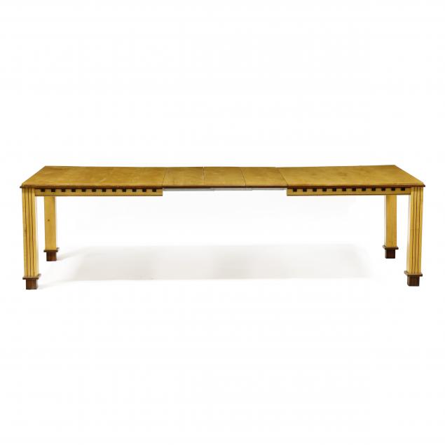 Post 1980, solid maple with exotic hardwood inlay and accents, rectangular raised panel top, dentil trim skirt, straight legs with vertical line inlay, raised cuff and alternating inlaid foot, with three leaves, appears unsigned.