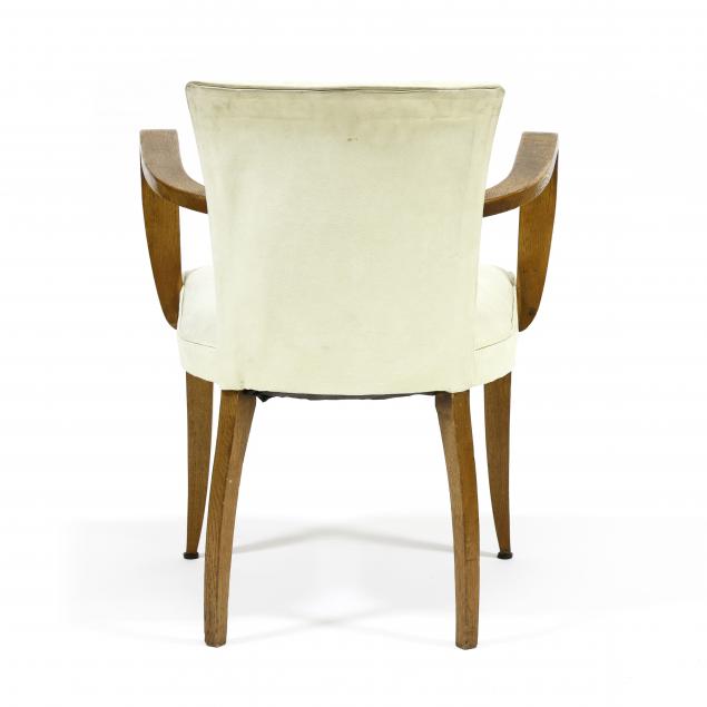 1930s, oak with varying upholstery, tapered waterfall arms on stylized saber legs, unmarked.