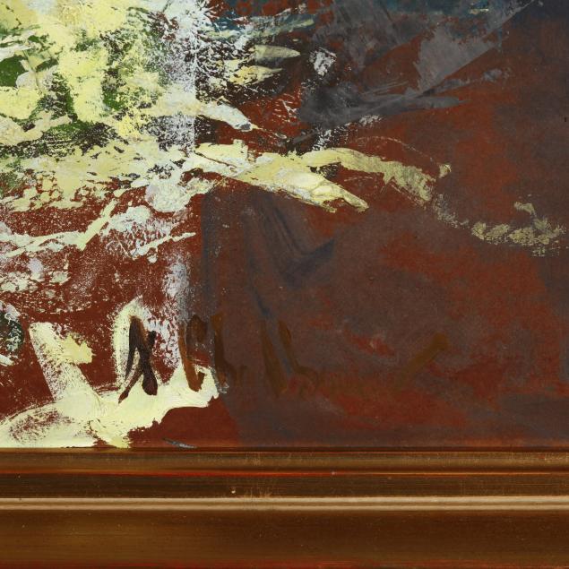 Oil on masonite, signed at lower right, presented in a contemporary giltwood frame.