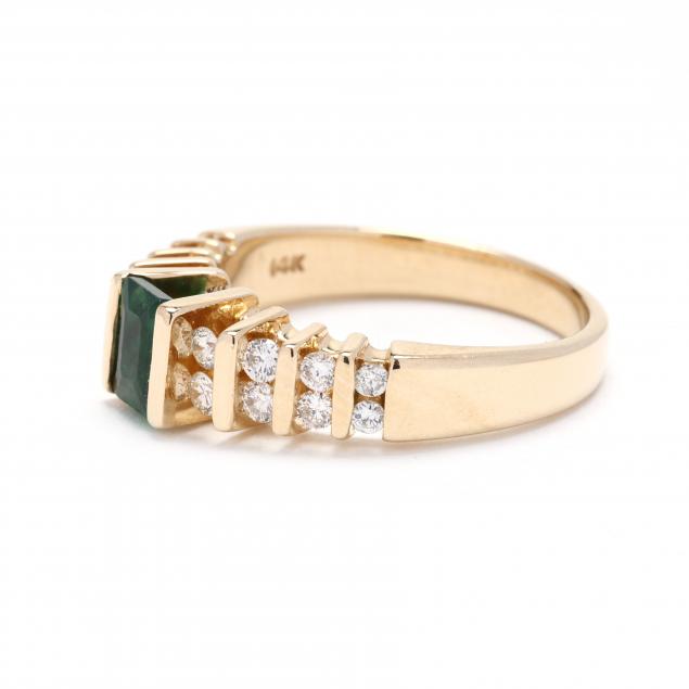 Centered on an emerald cut emerald (5.7 x 4.0 x 2.4 mm) weighing approximately .44 carat and with channel set full cut round diamond melee, stamped 14K and with B.H. maker's mark.