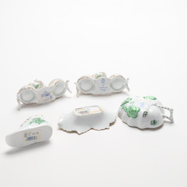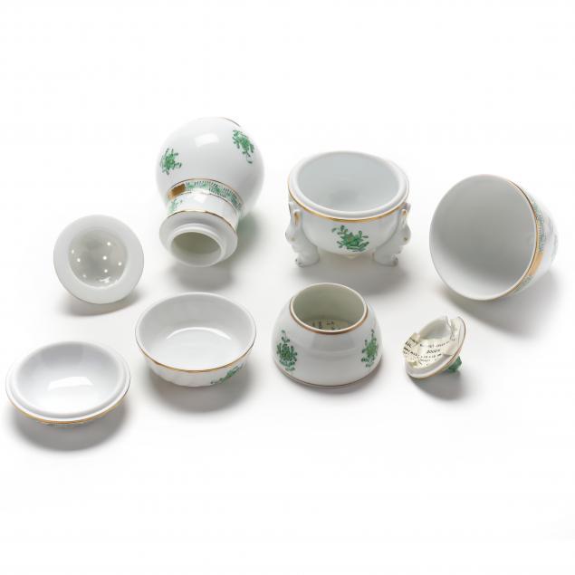 To include a pair of twin salt cellars with a putto knob (3 3/4 x 5 in.), a leaf form dish, a bootie, a shaker (5 in.), a toothpick urn, a jam pot, (2) display or trade signs, and others.