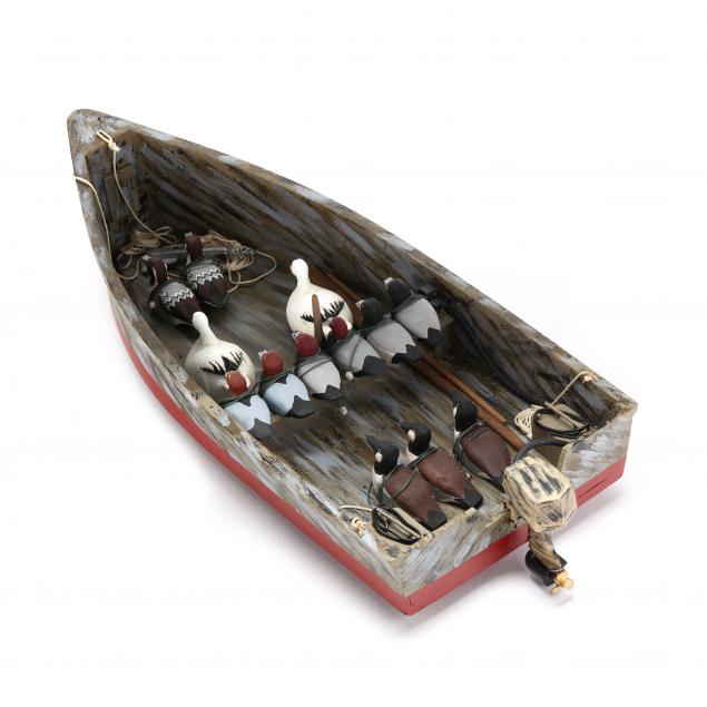 The skiff is a model of a traditional Core Sound working skiff. The decoys are hand carved and loose in the skiff.