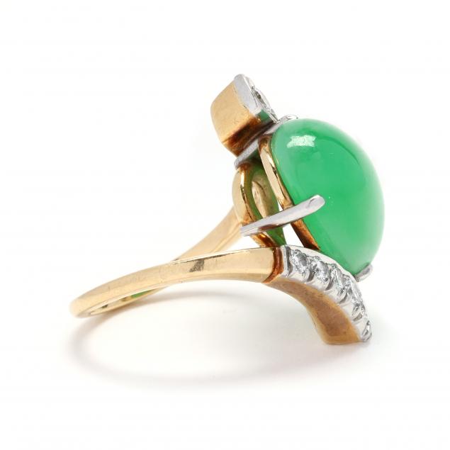 In a bypass design featuring a prong set oval double cabochon jadeite jade stone (15.20 x 10.90 x 7.24 mm) weighing approximately 10.82 carats, the gold bypass elements set with full cut round diamonds weighing approximately .46 total carat (I-J color, VS2-SI1 clarity), stamped 18K and with a maker's marks. With GIA Jade Report stating Jadeite Jade of natural color with no indications of impregnation and is known in the trade as "A Jade."