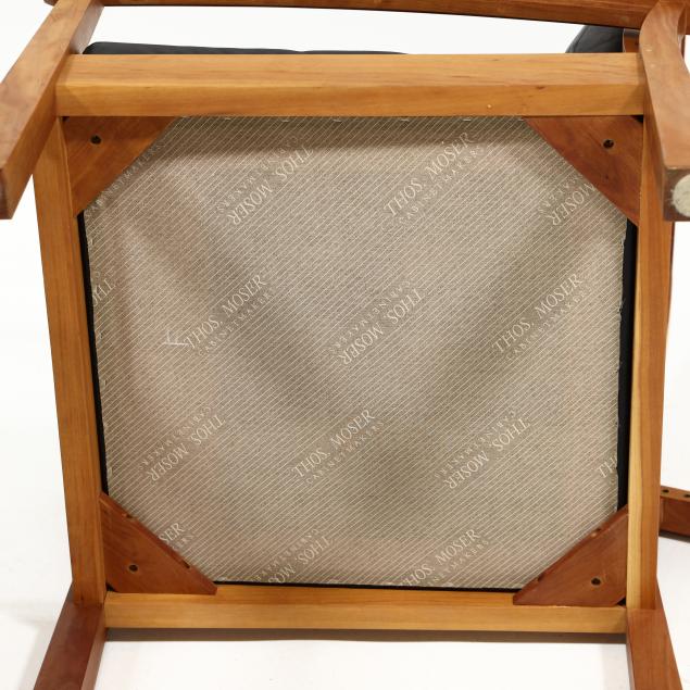 Maine, circa 2000, black leather cushion back and seat, adjustable back with brass rod support, arched arms with slightly rounded surface, reverse tapered legs, signed to interior seat rail.