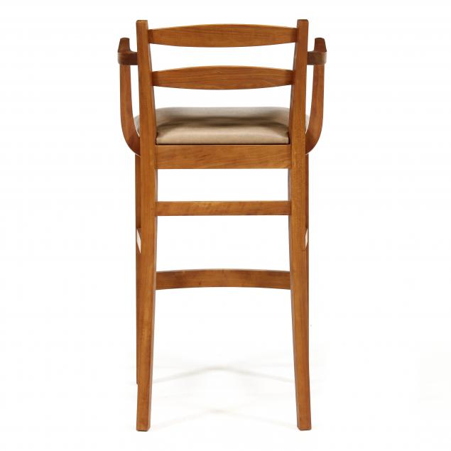 Maine, circa 2010, including a circular top table with open panel tapered pedestal on four shoe feet (40 x 34 in. diameter); and a pair of leather seat high chairs with ladder back, shaped arms, tapered legs with foot rail (43 x 22 x 19 in.), all signed.