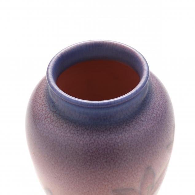 Circa 1938, lily decoration on a lavender to green gradient matte glazed ground, signed and marked to underside.