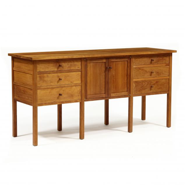 Maine, 2006, rectangular top, two central hinged paneled doors, shelved interior flanked by six flush graduated drawers with turned pulls raised on eight straight legs, paneled and finished back, signed under the bottom far right drawer.