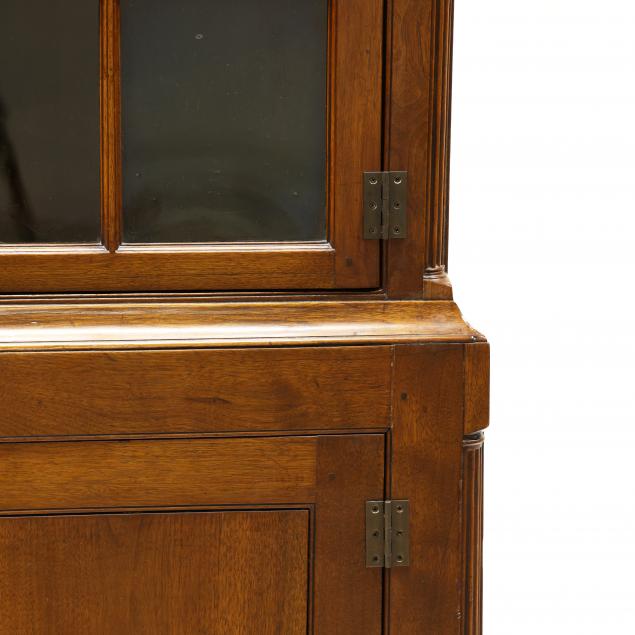 Attributed to Alamance County, circa 1800, poplar secondary, one part form, distinctive applied cornice with cove molding above scallop motif, two hinged upper case doors with eight window lights each, molded mullions, shelved interior, molded waist, two lower hinged flush-paneled doors, shelved interior, the upper case with reverse stop-fluted quarter columns, the lower case with fluted quarter columns, ninety-degree return at corner, applied bracket foot base with spur.