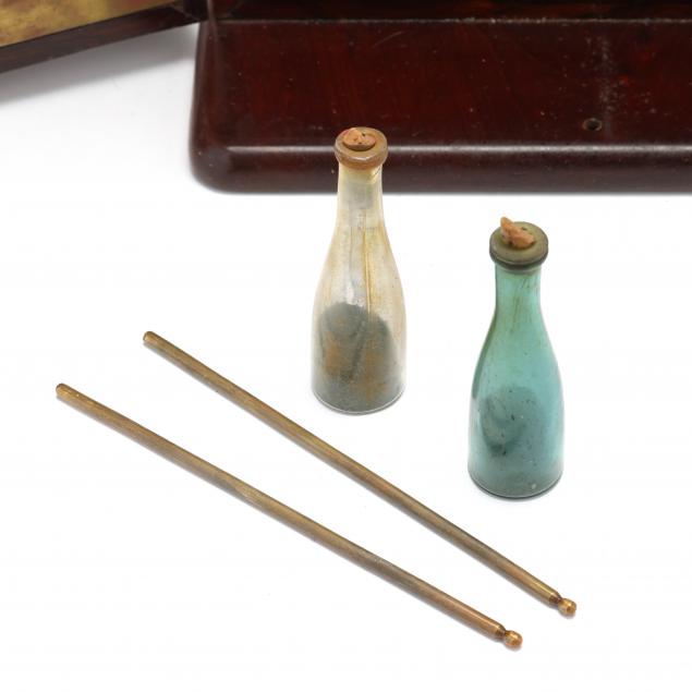 Circa 1820s, mahogany veneers, inlaid brass shield escutcheon, top with brass swing handle, the two front hinged doors open to a shelved interior fitted with 17 interior compartments, two pulls release sliding cabinet doors on the reverse, fitted with six additional drawers, retaining (3) old crystal stoppered bottles, (2) corked bottles, some old printed apothecary labels, the whole on a molded flush base, unmarked.