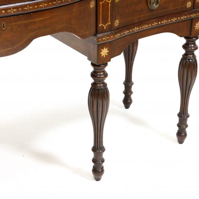 Late 20th century, labeled, figured mahogany veneers, bow front form, the rectangular case with molded edge, central conforming drawer above a concealed shaped drawer flanked on each side by two stacked concave drawers raised on six reeded turned legs, featuring mother of pearl and ebony inlays throughout.
