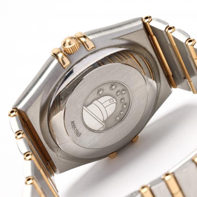 Reference number 1202.30.00, serial number 80051563, the stainless steel case with gold bezel featuring black enameled Roman numerals, the signed silver dial with luminous gold baton hour markers, luminous gold dagger hands and date window at 3:00 hour, completed with stainless steel and gold bracelet band numbered 861 and signed expanding fold-over clasp numbered 1551/861 / 45 / GAA, the case back with