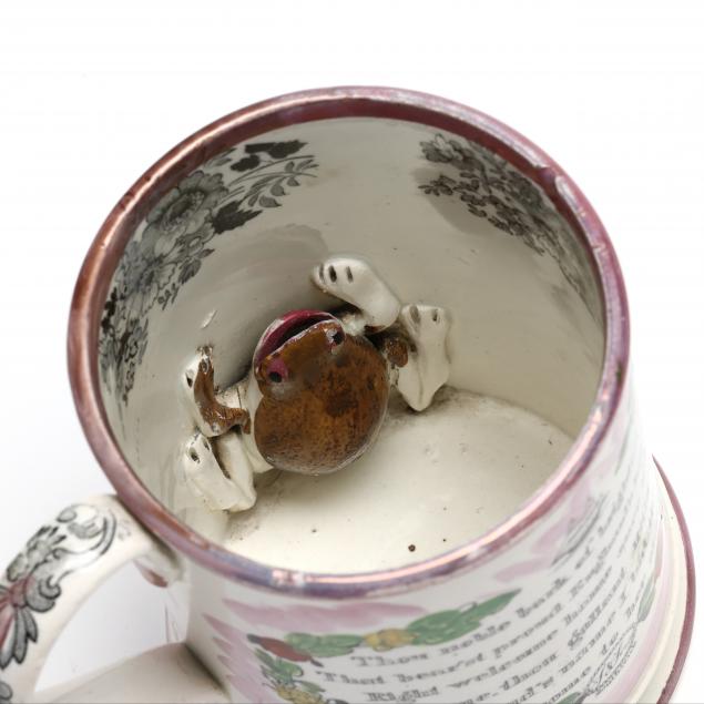 Staffordshire 19th century, tavern mugs with polychrome decoration each interior space with an applied frog which is revealed as one drinks, not marked.