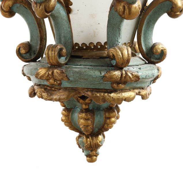 Early 20th century, carved, pierced, gilt and polychrome wood and wrought iron with six cherub supports, valanced and reeded dome top, leaf pattern, (6) opaque glass panels in wrought iron, scrolling leaf brackets.