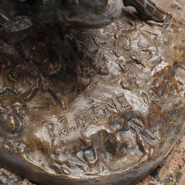 Late 19th-early 20th century, bronze with warm brown patina, signed and dated in casting to the naturalistic terrace " P. J. MENE 1844," resting atop a later marble base.