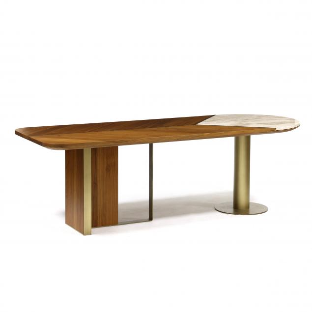 Contemporary, travertine, walnut veneer, brushed brass, bullet shaped top with asymmetrical designs and inset stone, on an asymmetrical double pedestal base, unmarked.