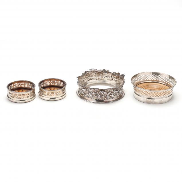 The largest, with mark of Woodside Sterling Co., pattern number 2002, with repousse floral decoration, without a base or monogram (5 1/2 in. dia.); the second, mark of Gorham, pattern number A7276, reticulated form with turned burlwood insert, monogrammed (4 7/8 in. dia.); the last, a pair of small coasters, mark of Goodnow & Jenks, circa 1893-1905, Boston, Massachusetts, pattern number 22, with reticulated foliate borders, bead course etches, and wood inserts with paterae inlay fans, without a monogram (3 in. dia.).