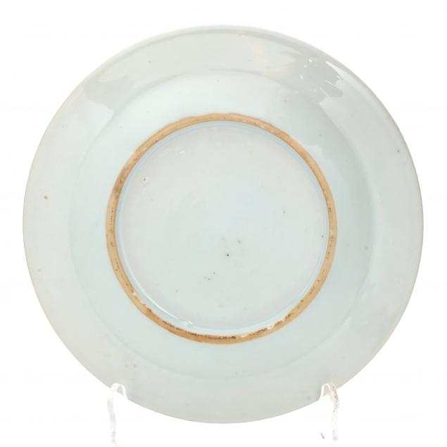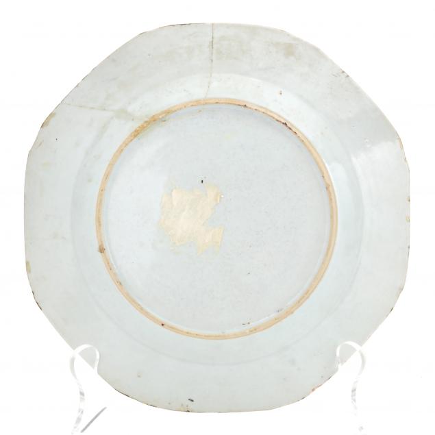 Mid to late 18th century, hand painted in Rose Mandarin manner with shaped reserves populated by outdoor gatherings of Chinese Mandarin figures, includes a two dinner plates (9 in. diameter)(one extensively repaired; light fritting to rim of other; hairline to rim), two bowls (Largest 3 in., 5 3/4 in. diameter)(hairline cracks and chips to rim of larger bowl; minor nicks to rim of smaller bowl), and a smaller dish (6 1/2 in. diameter)(minor nicks to foot rim; extensively restored).