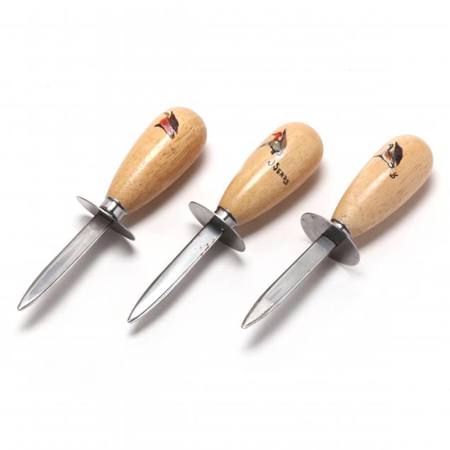Late 20th century, three birch handle oyster knives with hand painted waterfowl marked STAINLESS STEEL / TAIWAN, balsa wood block hand painted with two canvasback ducks.
