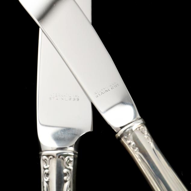 (69) pieces including: (9) knives (9 1/8 in.); (9) forks (7 3/8 in.); (9) salad forks; (17) teaspoons; (10) cream soup spoons; (8) flat handled butter spreaders; (2) hollow handled butter spreaders; (3) tablespoons; master butter knife; and a gravy ladle. Six of each place setting piece with period "W" monogram; others without monogram.