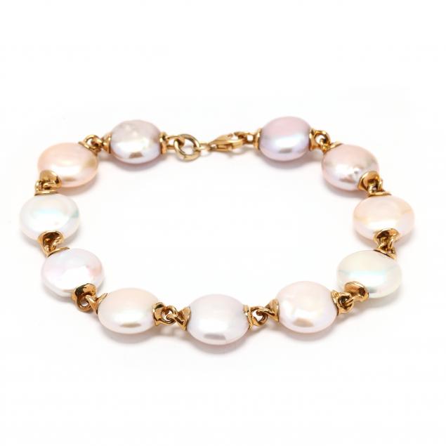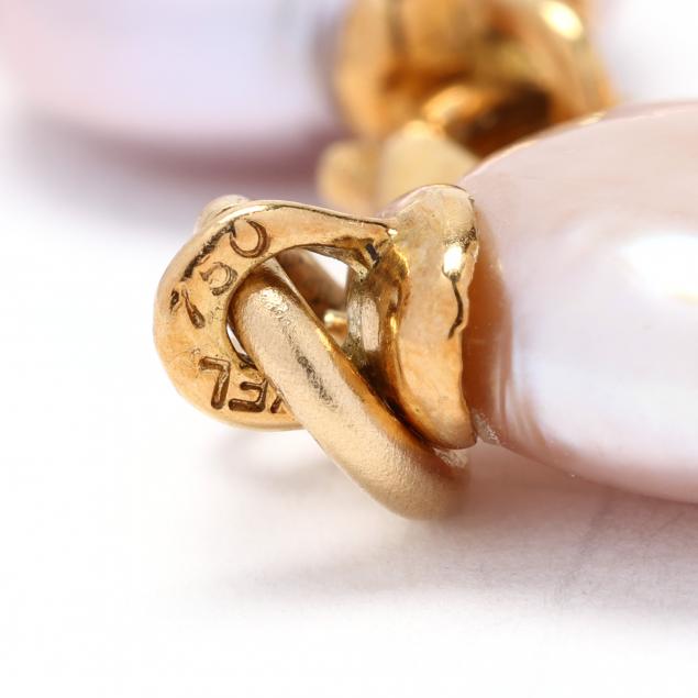 Suite to include: a necklace with (25) button pearls (12.5mm average) joined with gold cap links and completed with a lobster clasp, with maker's mark, clasp stamped 14K and end gold link stamped 750 and links testing 18KT (18.5 in.); a bracelet en suite with (11) button pearls (12.5mm average) and completed with a lobster clasp stamped 750, end cap signed and stamped 750 (8 in.); and a pair of earrings suspending a button pearl (12.3mm) with a melee diamond surmount, completed with ear wires, signed and testing 18KT (1 1/8 in.).