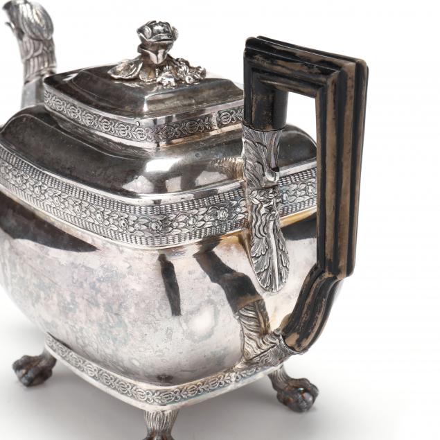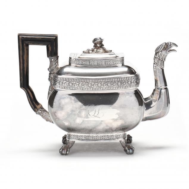 Early 19th century, unmarked, likely Philadelphia or New York, with eagle head spout and raised on four ball & claw feet, the hinged cover with floral and foliate finial, ebonized handle, period script monogram to one side.