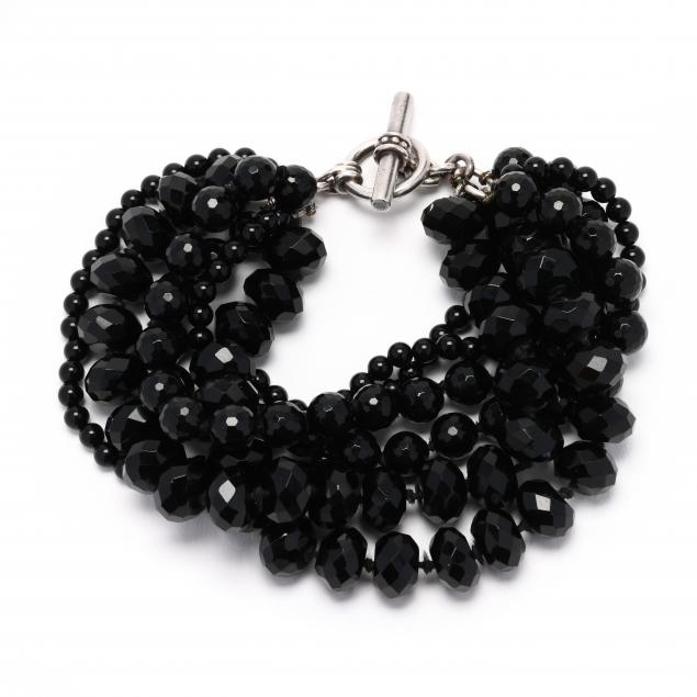 Bracelet strung knotted with faceted black onyx beads (8.0mm and 11.0mm) and round onyx beads (4.5mm) and completed with a toggle clasp, signed and stamped 925.