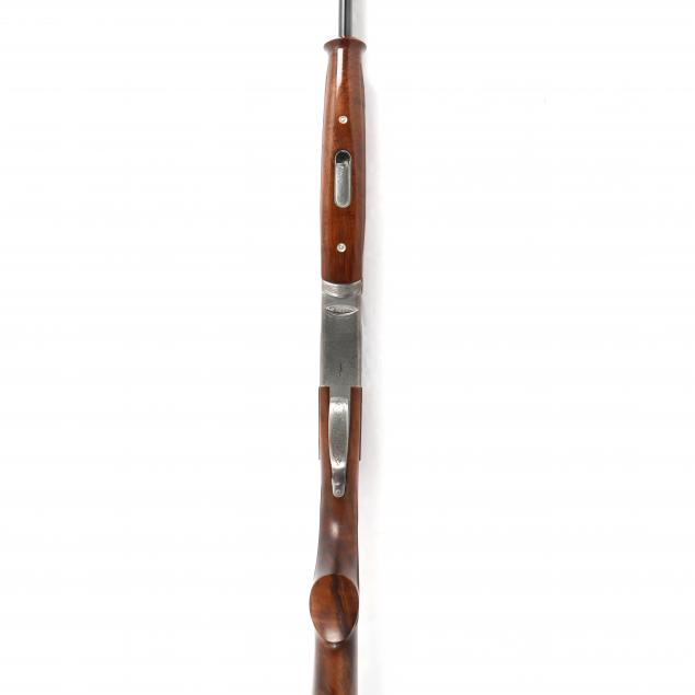 Serial number P76264B beneath barrel lever, barrel monoblock, and forend metal, 30 in. blued barrels marked SPORTING BERETTA - MADE IN ITALY / GARDONE VT / 410 GA. 3" - 30" / EXCELSIOR - HIGH STRENGTH ALLOYED STEEL, ventilated rib with front and mid bead sights, removable chokes M & IC, shell ejectors, receiver bottom is marked P BERETTA / S687 EELL / DIAMOND PIGEON with decorative floral and scroll engravings, lower tang marked BOTTEGA C. GIOVANELLI, gold plated single selective trigger, checkered walnut and forend with original buttpad marked P. BERETTA, original case with three additional chokes F, C, IM, two red hi-vis sights, extra buttpad, stock and barrel sleeves and BERETTA multi-purpose tool. LOP 14.5 in.
