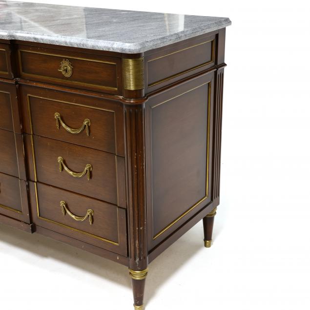 Second half 20th century, conforming grey marble top with molded edge, the case with twelve drawers with ormolu trim, reeded corners, paneled sides, tapered feet with ormolu mounts, appears unmarked.