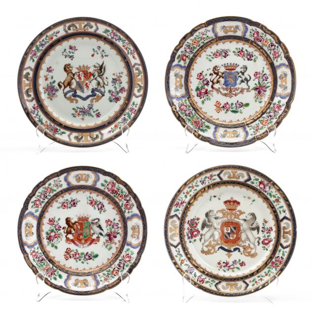 France, mid-19th century, all with armorial motif, most display a faux Chinese mark, typical of Edmé Samson, on the underside. There are two matched pair among the group.