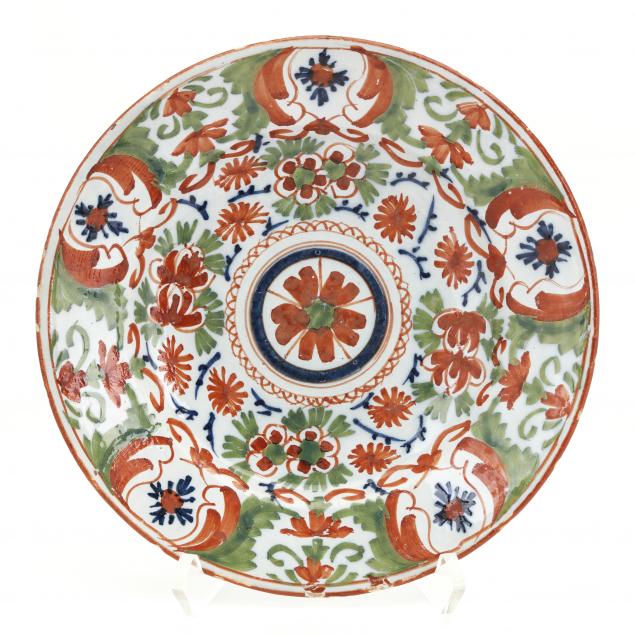 18th century, (5) five plates in three sizes, Famille Verte style, designed to be ornamental with allover pattern in three colors, of flowers and vines around a central blossom, one plate marked on the underside "XXX" , otherwise not marked. The chargers had original drill to the foot ring.