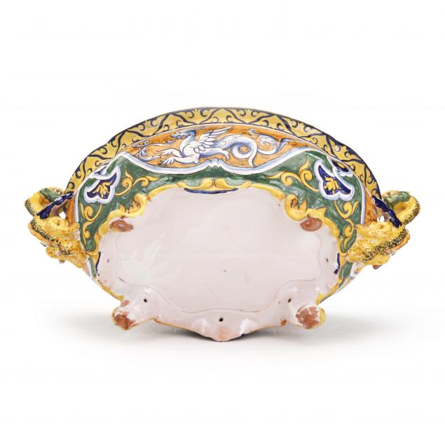 20th century, coupe form with applied dragon handles, the sides hand-painted with fire-breathing dragons in profile, raised on scrolled feet, not signed.